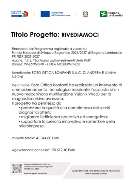 con la sua giovane e moderna struttura offre un'ampia gamma di servizi altamente tecnologici adatti ad ogni esigenza. L'azienda individuale nasce nel 1979 fondata da Bonfanti Mariangela ed oggi è ceduta ai figli Luana e Andrea. Lo studio occupa uno spazio di 140mq. dedicati alla propria clientela con: banco per la vendita al dettaglio, centro stampa e taglio, sala di posa, laboratorio digitale, esposizione occhiali, ottico con studio progettazione lenti progressive.